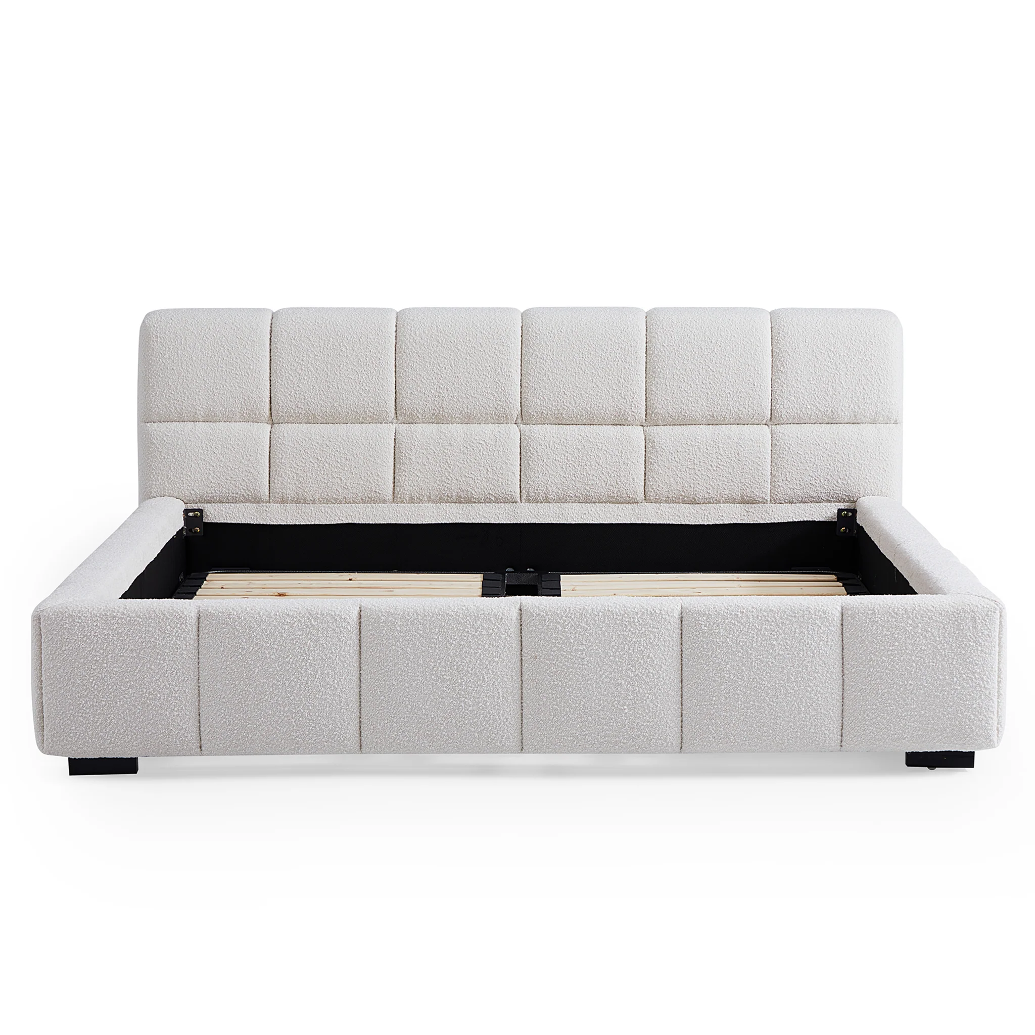 Cushy Boucle Fabric Bed – Contemporary Upholstered Platform Bed in Cream Bouclé with Padded Headboard