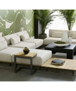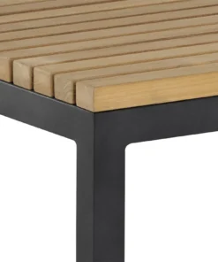 Appreciate warmth and sunlight while seated in an outdoor dining space inspired by the Arizona desert. This modern end table features a powder-coated aluminum base with a natural teak wood top. Suitable for indoor and covered outdoor spaces.
